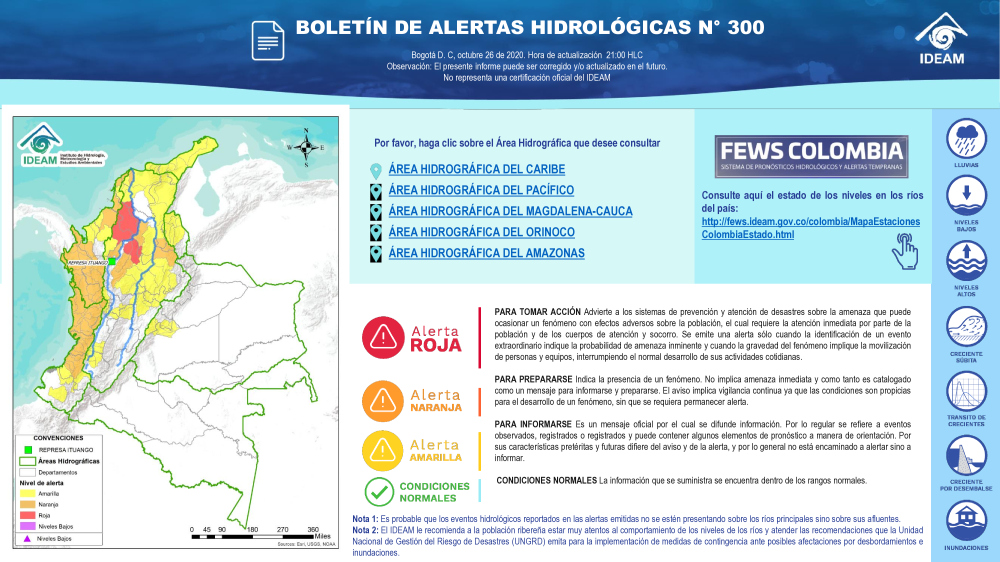 En general, el seguimiento que hace el Ideam del comportamiento hidrológico en los principales ríos del país se realiza con la información horaria en tiempo real que se recibe de las estaciones automáticas, complementadas con más de 40 estaciones hidrológicas que transmiten en las primeras horas cada mañana, los 365 días del año.