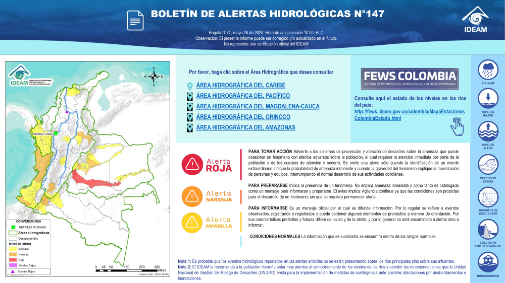 En general, el seguimiento que hace el Ideam del comportamiento hidrológico en los principales ríos del país se realiza con la información horaria en tiempo real que se recibe de las estaciones automáticas, complementadas con más de 40 estaciones hidrológicas que transmiten en las primeras horas cada mañana, los 365 días del año.