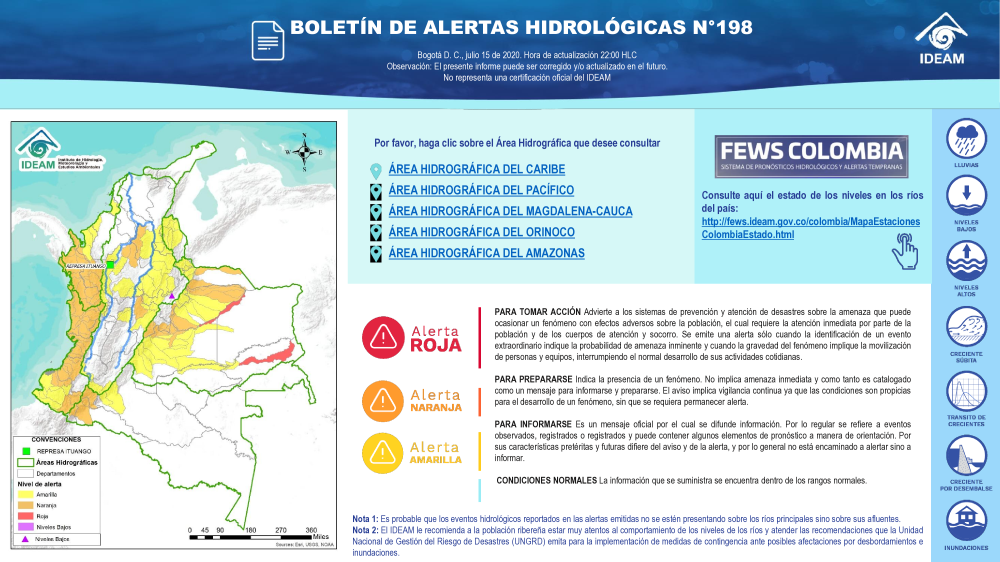 En general, el seguimiento que hace el Ideam del comportamiento hidrológico en los principales ríos del país se realiza con la información horaria en tiempo real que se recibe de las estaciones automáticas, complementadas con más de 40 estaciones hidrológicas que transmiten en las primeras horas cada mañana, los 365 días del año.