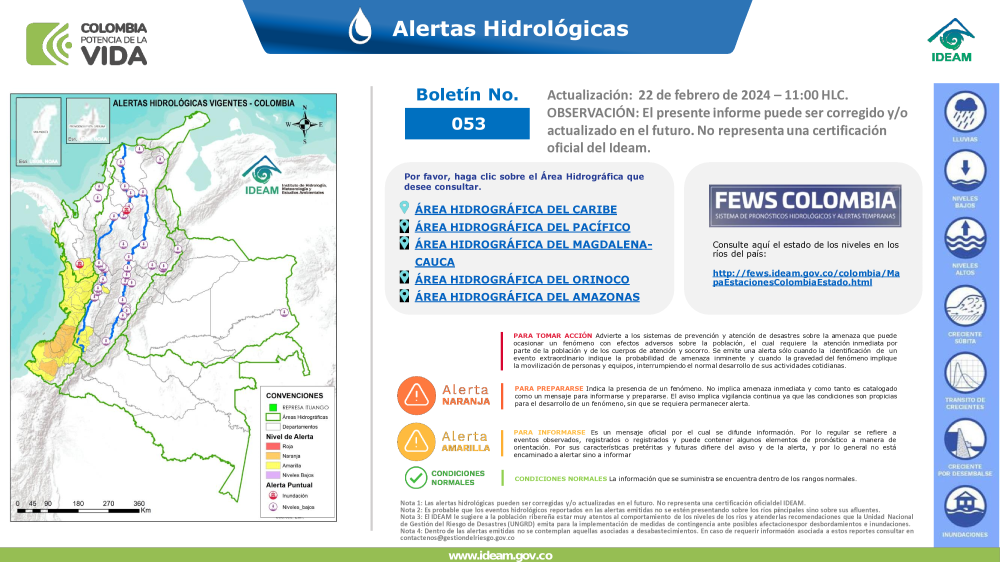 Además, en las cinco vertientes hidrográficas del territorio colombiano el Ideam tiene 834 estaciones hidrológicas (389 limnimétricas y 445 limnigráficas) para suministrar datos sobre el régimen hidrológico de los cauces y cuerpos de agua principales, para hacer seguimiento al proceso de la escorrentía en el ciclo hidrológico y a los eventos extremos asociados. Algunos parámetros se observan dos veces al día, como el nivel del río y la concentración de sedimentos.
