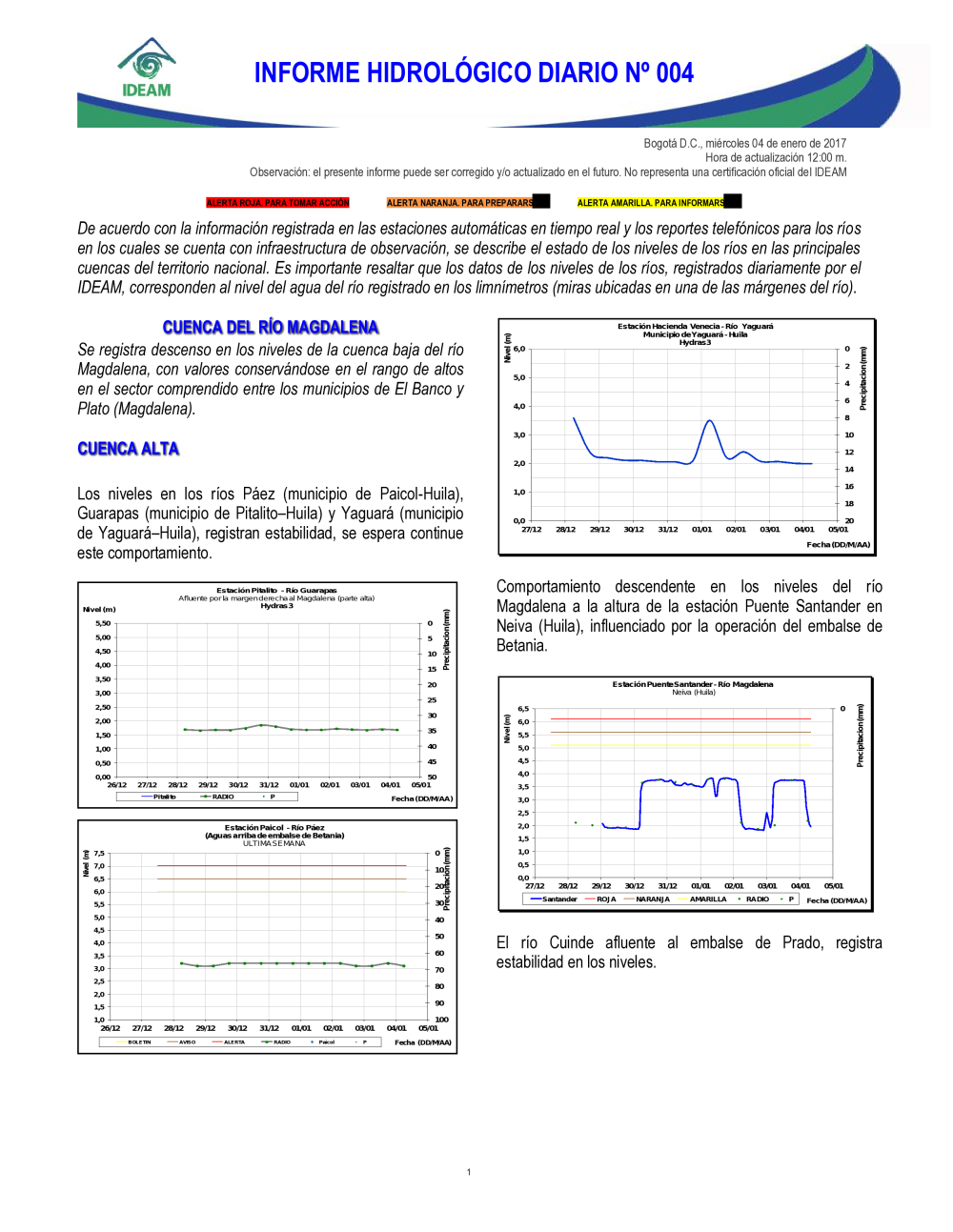 En general, el seguimiento que hace el Ideam del comportamiento hidrológico en los principales ríos del país se realiza con la información horaria en tiempo real que se recibe de las estaciones automáticas, complementadas con más de 40 estaciones hidrológicas que transmiten en las primeras horas cada mañana, los 365 días del año.