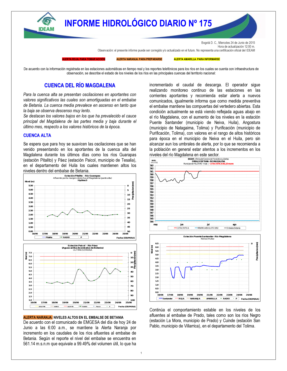 En general, el seguimiento que hace el Ideam del comportamiento hidrológico en los principales ríos del país se realiza con la información horaria en tiempo real que se recibe de las estaciones automáticas, complementadas con más de 40 estaciones hidrológicas que transmiten en las primeras horas cada mañana, los 365 días del año.