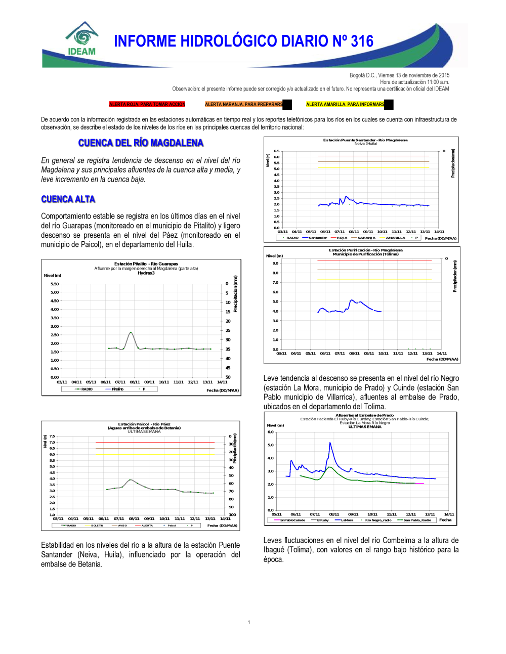 En general, el seguimiento que hace el Ideam del comportamiento hidrológico en los principales ríos del país se realiza con la información horaria en tiempo real que se recibe de las estaciones automáticas, complementadas con más de 40 estaciones hidrológicas que transmiten en las primeras horas cada mañana, los 365 días del año.