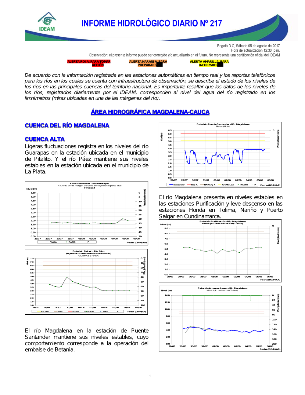 En general, el seguimiento que hace el Ideam del comportamiento hidrológico en los principales ríos del país se realiza con la información horaria en tiempo real que se recibe de las estaciones automáticas, complementadas con más de 40 estaciones hidrológicas que transmiten en las primeras horas cada mañana, los 365 días del año.