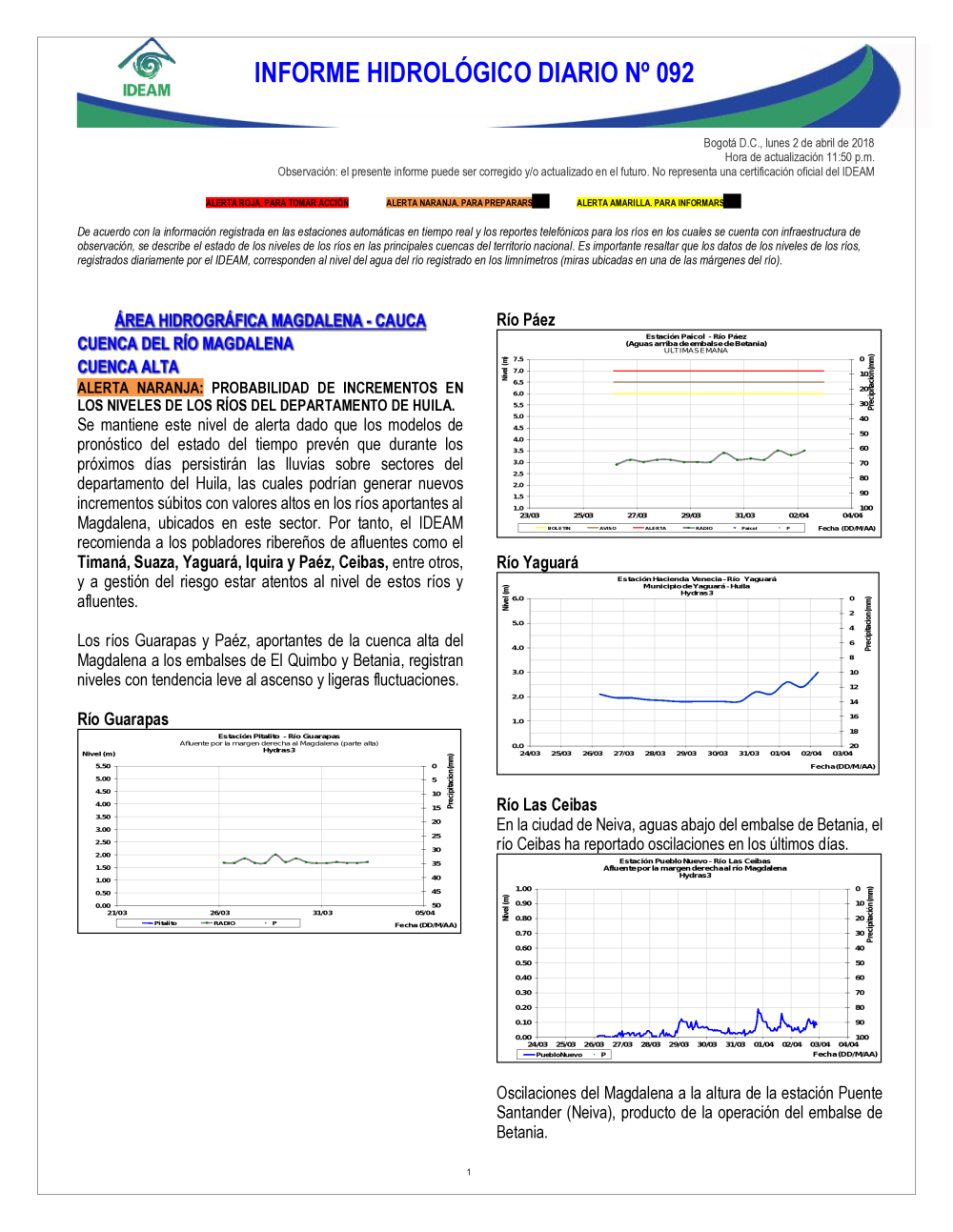 En general, el seguimiento que hace el Ideam del comportamiento hidrológico en los principales ríos del país se realiza con la información horaria en tiempo real que se recibe de las estaciones automáticas, complementadas con más de 40 estaciones hidrológicas que transmiten en las primeras horas cada mañana, los 365 días del año.