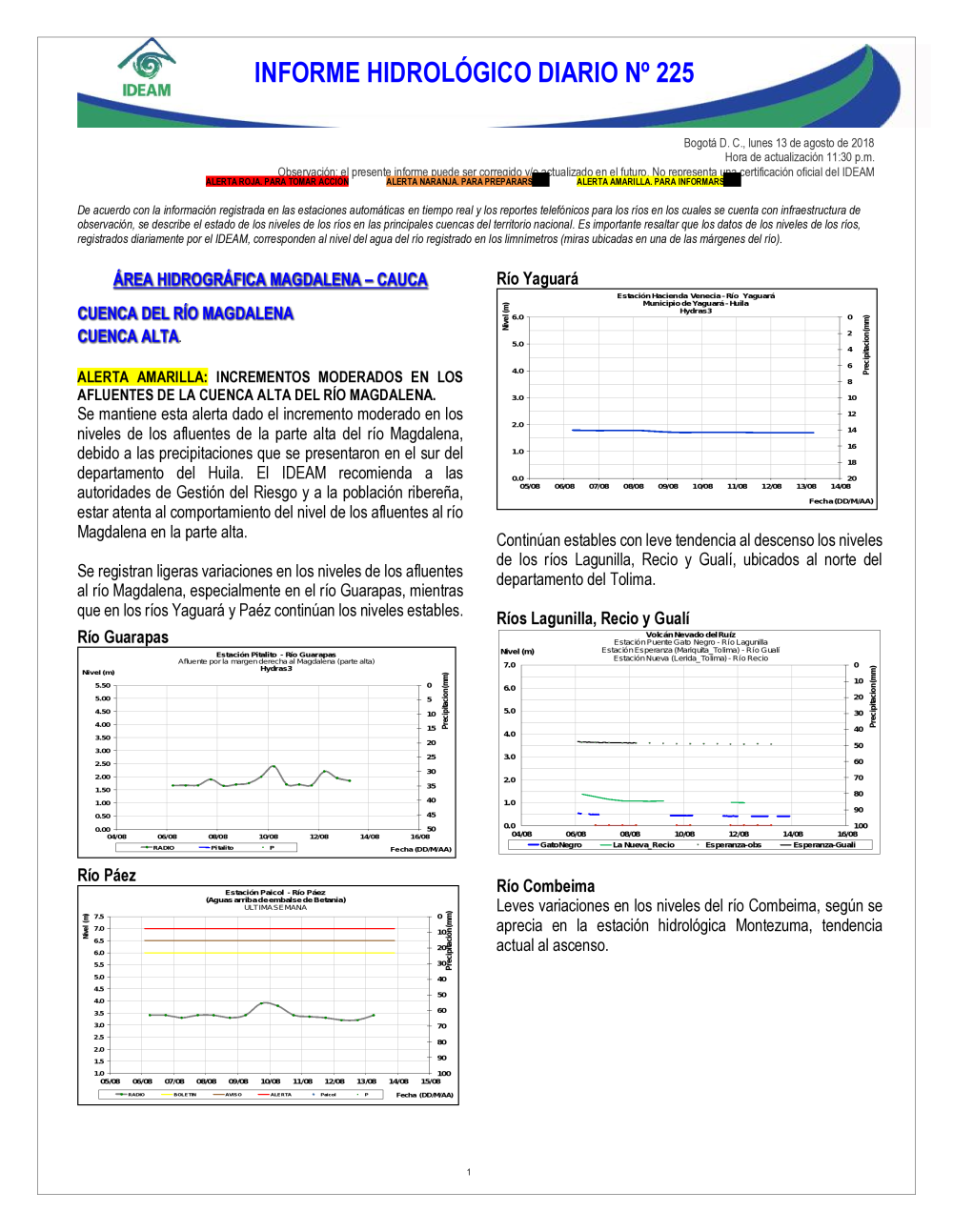 En general, el seguimiento que hace el Ideam del comportamiento hidrológico en los principales ríos del país se realiza con la información horaria en tiempo real que se recibe de las estaciones automáticas, complementadas con más de 40 estaciones hidrológicas que transmiten en las primeras horas cada mañana, los 365 días del año.