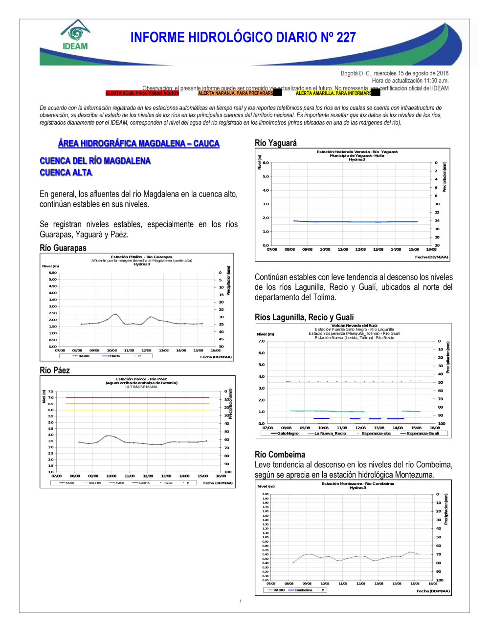 En general, el seguimiento que hace el Ideam del comportamiento hidrológico en los principales ríos del país se realiza con la información horaria en tiempo real que se recibe de las estaciones automáticas, complementadas con más de 40 estaciones hidrológicas que transmiten en las primeras horas cada mañana, los 365 días del año.