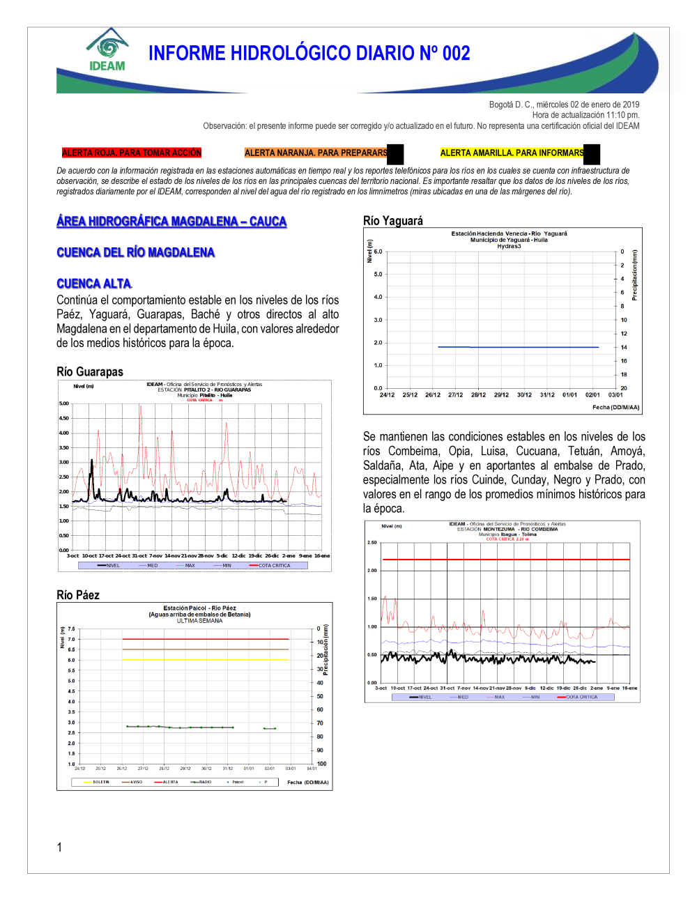 En general, el seguimiento que hace el Ideam del comportamiento hidrológico en los principales ríos del país se realiza con la información horaria en tiempo real que se recibe de las estaciones automáticas, complementadas con más de 40 estaciones hidrológicas que transmiten en las primeras horas cada mañana, los 365 días del año.