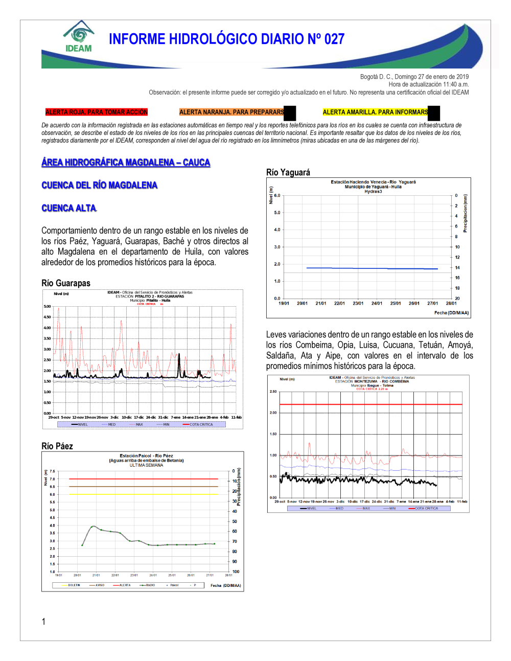 En general, el seguimiento que hace el Ideam del comportamiento hidrológico en los principales ríos del país se realiza con la información horaria en tiempo real que se recibe de las estaciones automáticas, complementadas con más de 40 estaciones hidrológicas que transmiten en las primeras horas cada mañana, los 365 días del año.