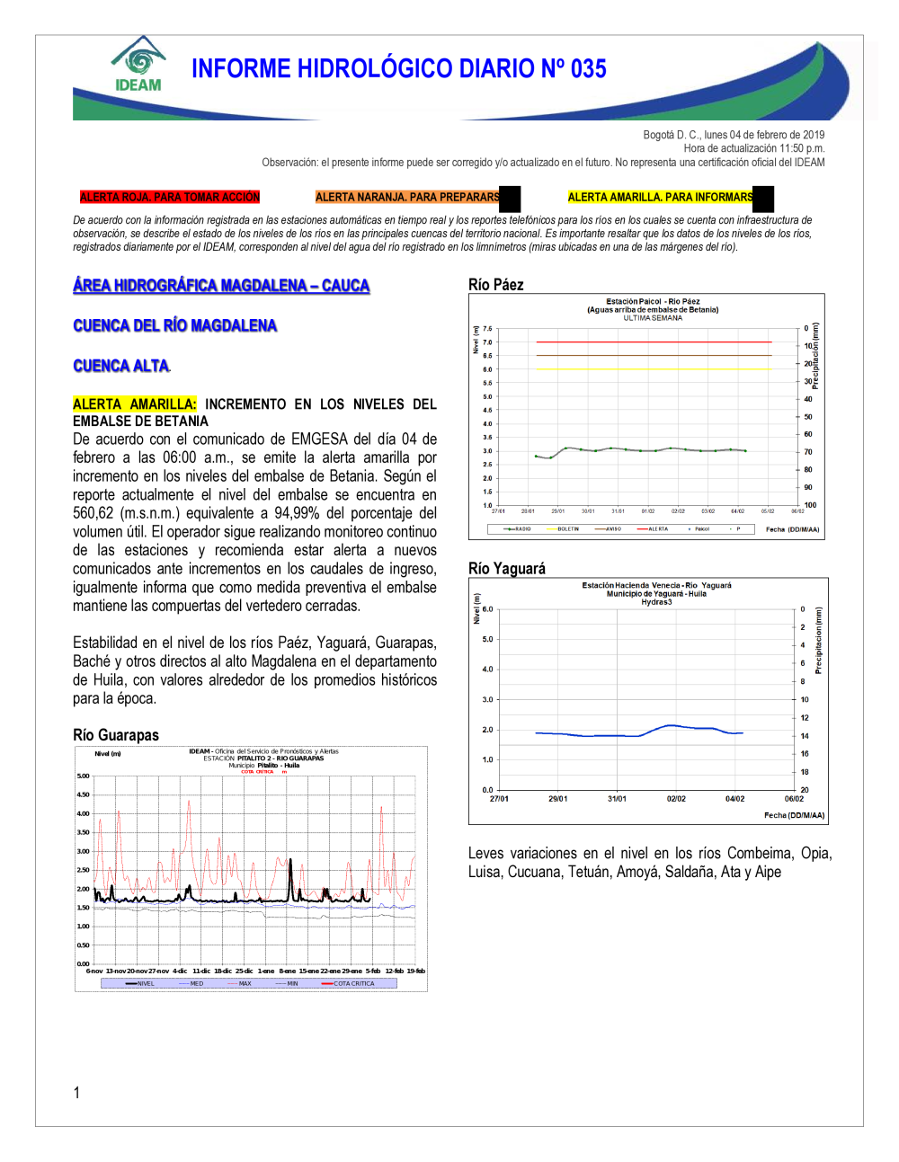 En general, el seguimiento que hace el Ideam del comportamiento hidrológico en los principales ríos del país se realiza con la información horaria en tiempo real que se recibe de las estaciones automáticas, complementadas con más de 40 estaciones hidrológicas que transmiten en las primeras horas cada mañana, los 365 días del año.