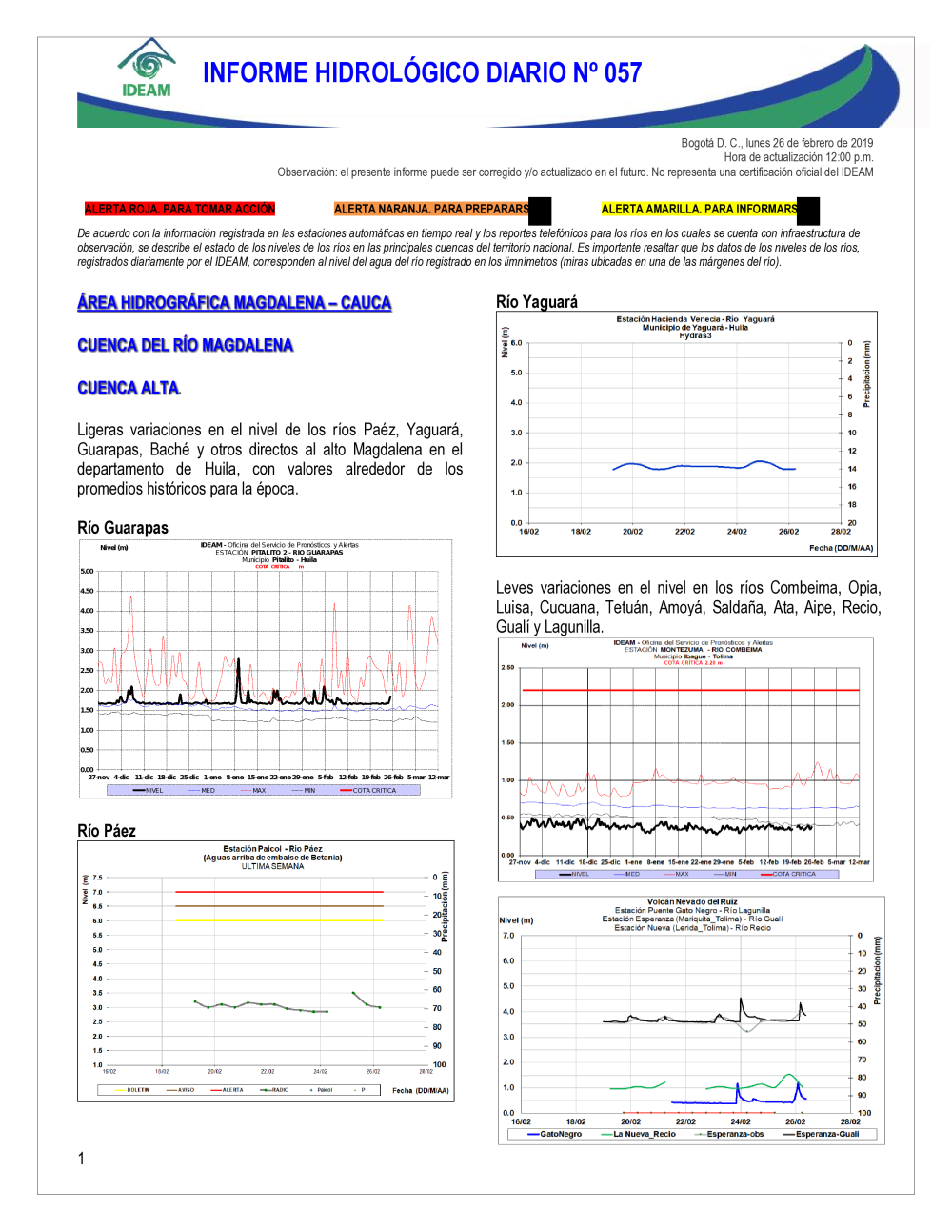 En general, el seguimiento que hace el Ideam del comportamiento hidrológico en los principales ríos del país se realiza con la información horaria en tiempo real que se recibe de las estaciones automáticas, complementadas con más de 40 estaciones hidrológicas que transmiten en las primeras horas cada mañana, los 365 días del año.