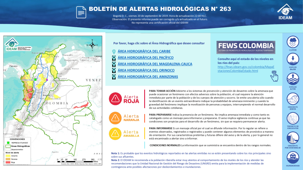 Además, en las cinco vertientes hidrográficas del territorio colombiano el Ideam tiene 834 estaciones hidrológicas (389 limnimétricas y 445 limnigráficas) para suministrar datos sobre el régimen hidrológico de los cauces y cuerpos de agua principales, para hacer seguimiento al proceso de la escorrentía en el ciclo hidrológico y a los eventos extremos asociados. Algunos parámetros se observan dos veces al día, como el nivel del río y la concentración de sedimentos.