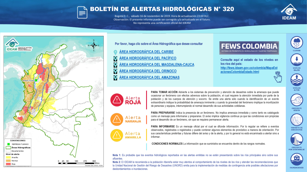 Además, en las cinco vertientes hidrográficas del territorio colombiano el Ideam tiene 834 estaciones hidrológicas (389 limnimétricas y 445 limnigráficas) para suministrar datos sobre el régimen hidrológico de los cauces y cuerpos de agua principales, para hacer seguimiento al proceso de la escorrentía en el ciclo hidrológico y a los eventos extremos asociados. Algunos parámetros se observan dos veces al día, como el nivel del río y la concentración de sedimentos.