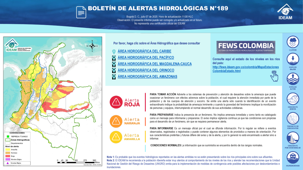 Además, en las cinco vertientes hidrográficas del territorio colombiano el Ideam tiene 834 estaciones hidrológicas (389 limnimétricas y 445 limnigráficas) para suministrar datos sobre el régimen hidrológico de los cauces y cuerpos de agua principales, para hacer seguimiento al proceso de la escorrentía en el ciclo hidrológico y a los eventos extremos asociados. Algunos parámetros se observan dos veces al día, como el nivel del río y la concentración de sedimentos.