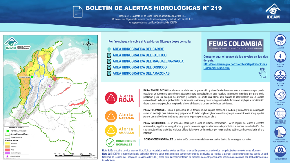 En general, el seguimiento que hace el Ideam del comportamiento hidrológico en los principales ríos del país se realiza con la información horaria en tiempo real que se recibe de las estaciones automáticas, complementadas con más de 40 estaciones hidrológicas que transmiten en las primeras horas cada mañana, los 365 días del año.