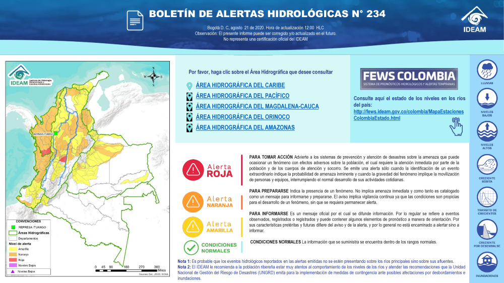 Además, en las cinco vertientes hidrográficas del territorio colombiano el Ideam tiene 834 estaciones hidrológicas (389 limnimétricas y 445 limnigráficas) para suministrar datos sobre el régimen hidrológico de los cauces y cuerpos de agua principales, para hacer seguimiento al proceso de la escorrentía en el ciclo hidrológico y a los eventos extremos asociados. Algunos parámetros se observan dos veces al día, como el nivel del río y la concentración de sedimentos.