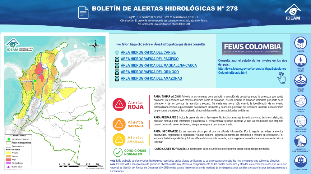 En general, el seguimiento que hace el Ideam del comportamiento hidrológico en los principales ríos del país se realiza con la información horaria en tiempo real que se recibe de las estaciones automáticas, complementadas con más de 40 estaciones hidrológicas que transmiten en las primeras horas cada mañana, los 365 días del año.