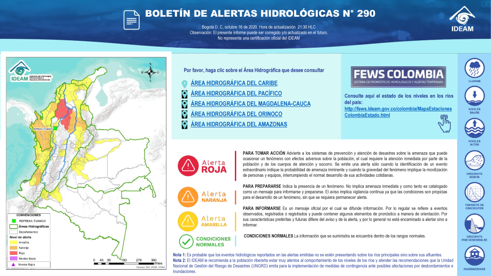 Además, en las cinco vertientes hidrográficas del territorio colombiano el Ideam tiene 834 estaciones hidrológicas (389 limnimétricas y 445 limnigráficas) para suministrar datos sobre el régimen hidrológico de los cauces y cuerpos de agua principales, para hacer seguimiento al proceso de la escorrentía en el ciclo hidrológico y a los eventos extremos asociados. Algunos parámetros se observan dos veces al día, como el nivel del río y la concentración de sedimentos.