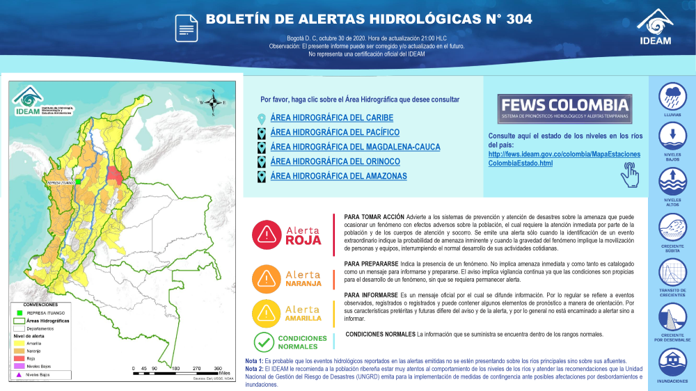 Además, en las cinco vertientes hidrográficas del territorio colombiano el Ideam tiene 834 estaciones hidrológicas (389 limnimétricas y 445 limnigráficas) para suministrar datos sobre el régimen hidrológico de los cauces y cuerpos de agua principales, para hacer seguimiento al proceso de la escorrentía en el ciclo hidrológico y a los eventos extremos asociados. Algunos parámetros se observan dos veces al día, como el nivel del río y la concentración de sedimentos.