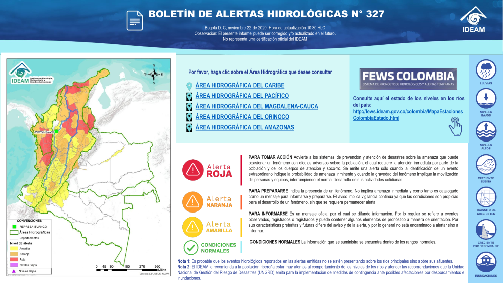 En general, el seguimiento que hace el Ideam del comportamiento hidrológico en los principales ríos del país se realiza con la información horaria en tiempo real que se recibe de las estaciones automáticas, complementadas con más de 40 estaciones hidrológicas que transmiten en las primeras horas cada mañana, los 365 días del año.
