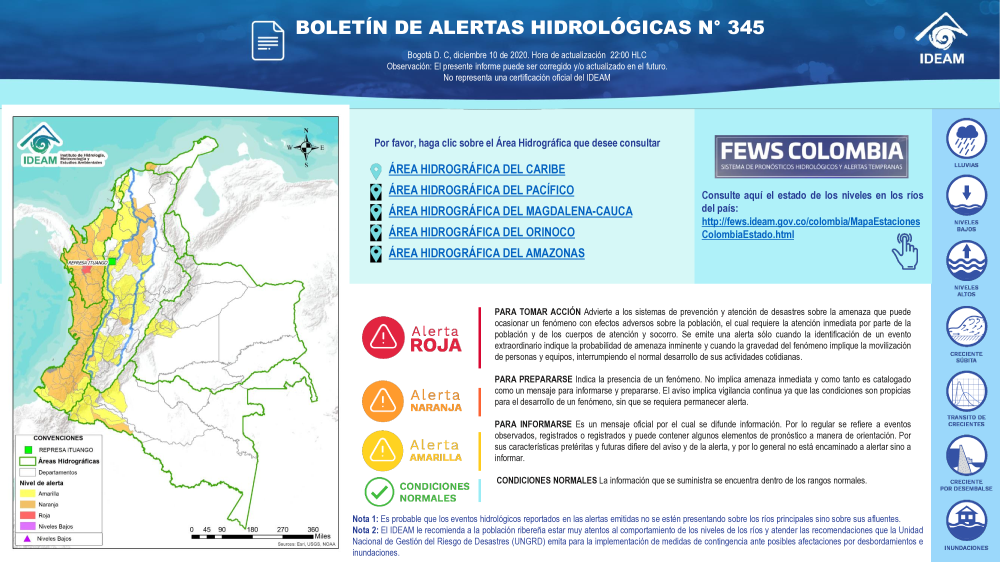 Además, en las cinco vertientes hidrográficas del territorio colombiano el Ideam tiene 834 estaciones hidrológicas (389 limnimétricas y 445 limnigráficas) para suministrar datos sobre el régimen hidrológico de los cauces y cuerpos de agua principales, para hacer seguimiento al proceso de la escorrentía en el ciclo hidrológico y a los eventos extremos asociados. Algunos parámetros se observan dos veces al día, como el nivel del río y la concentración de sedimentos.