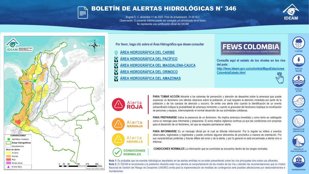En general, el seguimiento que hace el Ideam del comportamiento hidrológico en los principales ríos del país se realiza con la información horaria en tiempo real que se recibe de las estaciones automáticas, complementadas con más de 40 estaciones hidrológicas que transmiten en las primeras horas cada mañana, los 365 días del año.