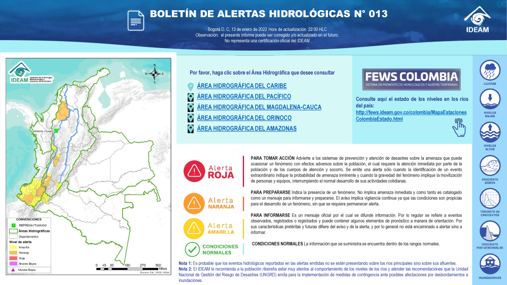 En general, el seguimiento que hace el Ideam del comportamiento hidrológico en los principales ríos del país se realiza con la información horaria en tiempo real que se recibe de las estaciones automáticas, complementadas con más de 40 estaciones hidrológicas que transmiten en las primeras horas cada mañana, los 365 días del año.