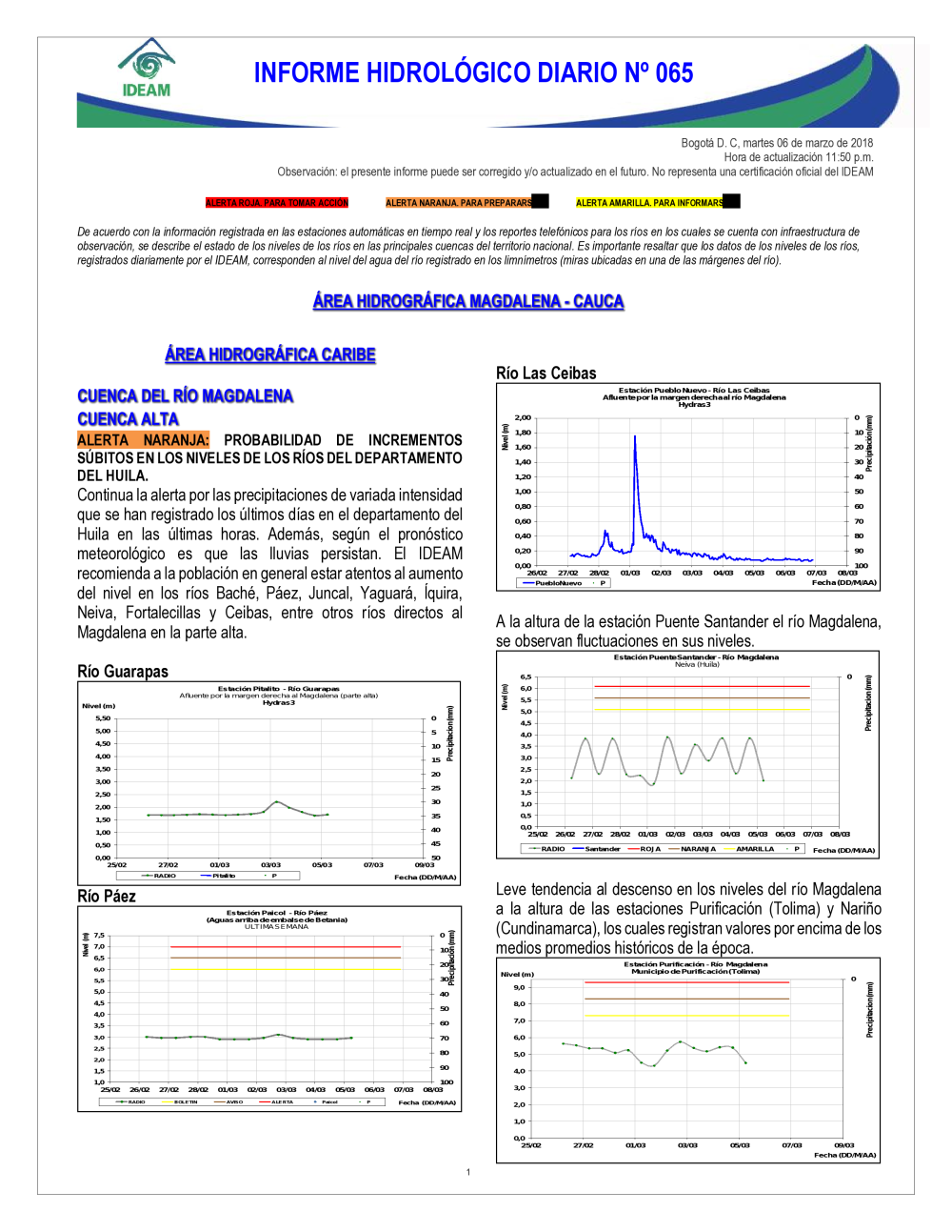 En general, el seguimiento que hace el Ideam del comportamiento hidrológico en los principales ríos del país se realiza con la información horaria en tiempo real que se recibe de las estaciones automáticas, complementadas con más de 40 estaciones hidrológicas que transmiten en las primeras horas cada mañana, los 365 días del año.