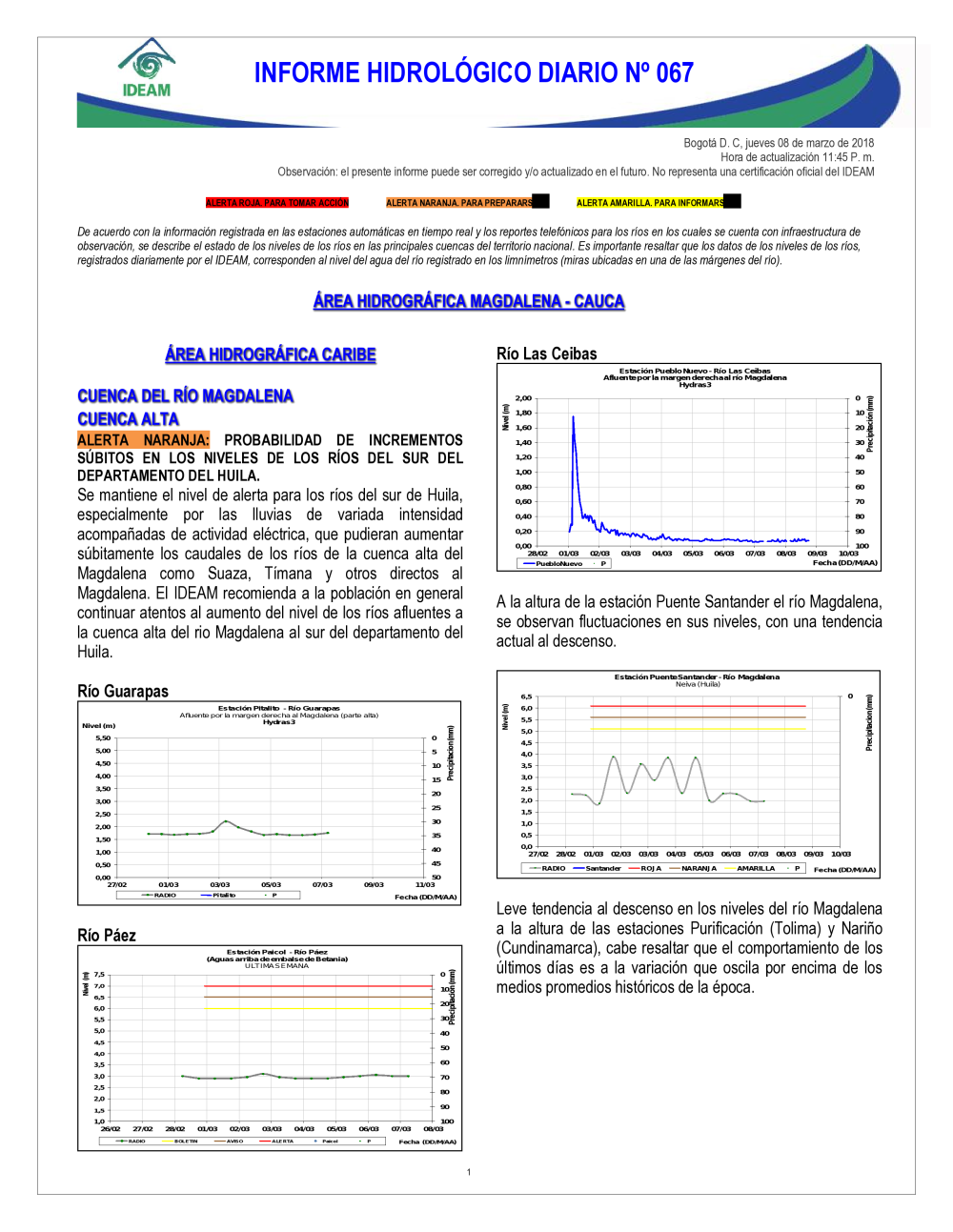 En general, el seguimiento que hace el Ideam del comportamiento hidrológico en los principales ríos del país se realiza con la información horaria en tiempo real que se recibe de las estaciones automáticas, complementadas con más de 40 estaciones hidrológicas que transmiten en las primeras horas cada mañana, los 365 días del año.
