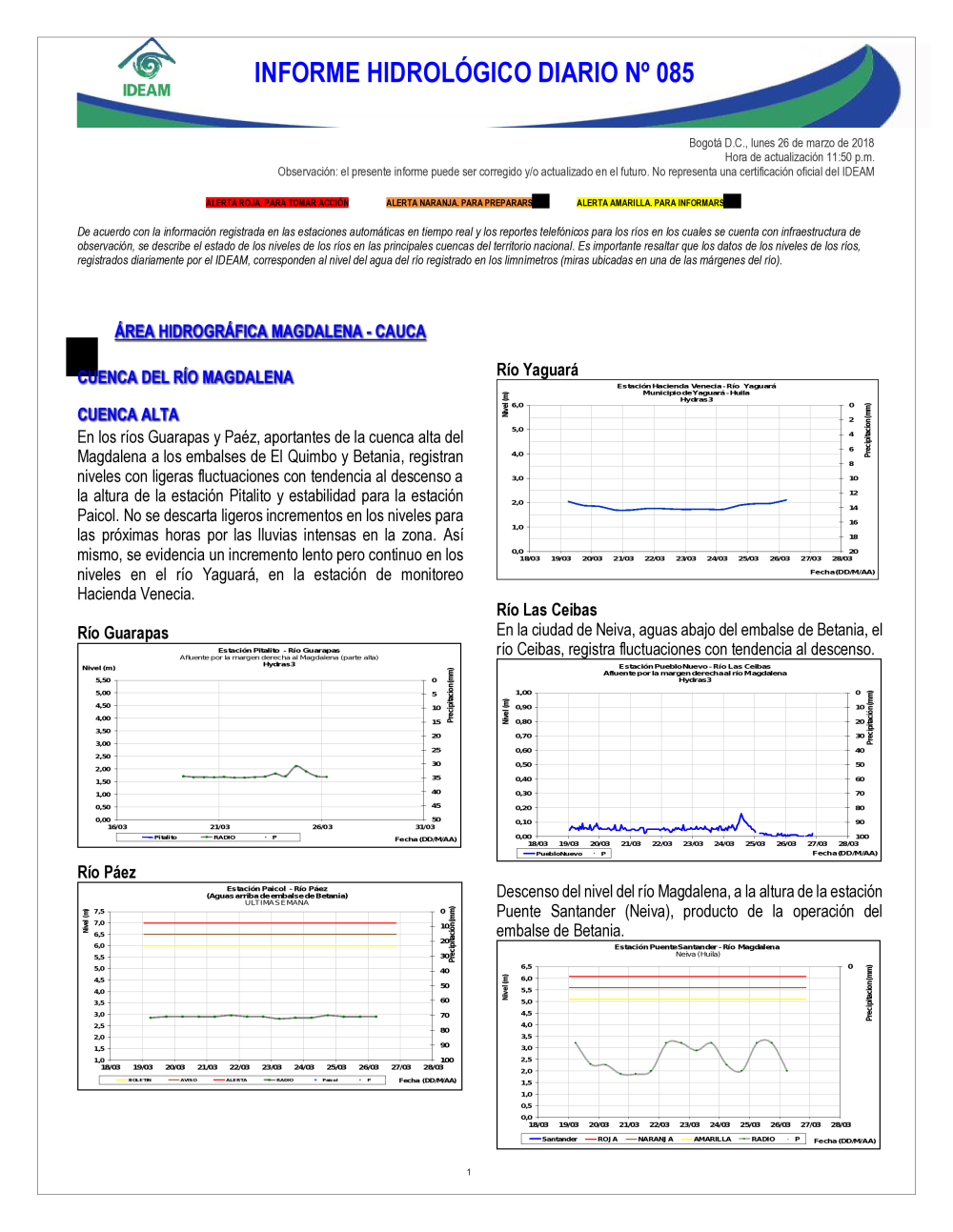 En general, el seguimiento que hace el Ideam del comportamiento hidrológico en los principales ríos del país se realiza con la información horaria en tiempo real que se recibe de las estaciones automáticas, complementadas con más de 40 estaciones hidrológicas que transmiten en las primeras horas cada mañana, los 365 días del año.