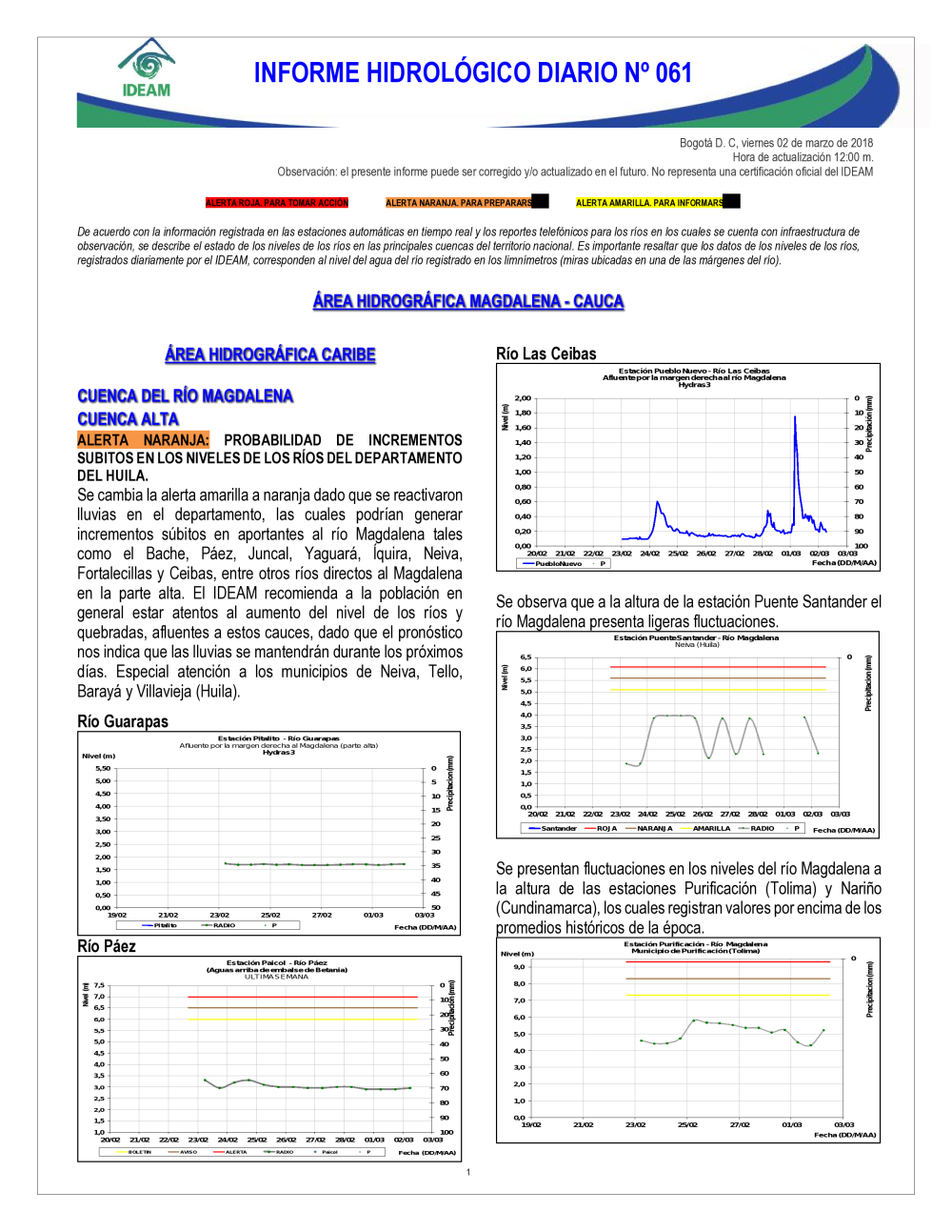 En general, el seguimiento que hace el Ideam del comportamiento hidrológico en los principales ríos del país se realiza con la información horaria en tiempo real que se recibe de las estaciones automáticas, complementadas con más de 40 estaciones hidrológicas que transmiten en las primeras horas cada mañana, los 365 días del año.