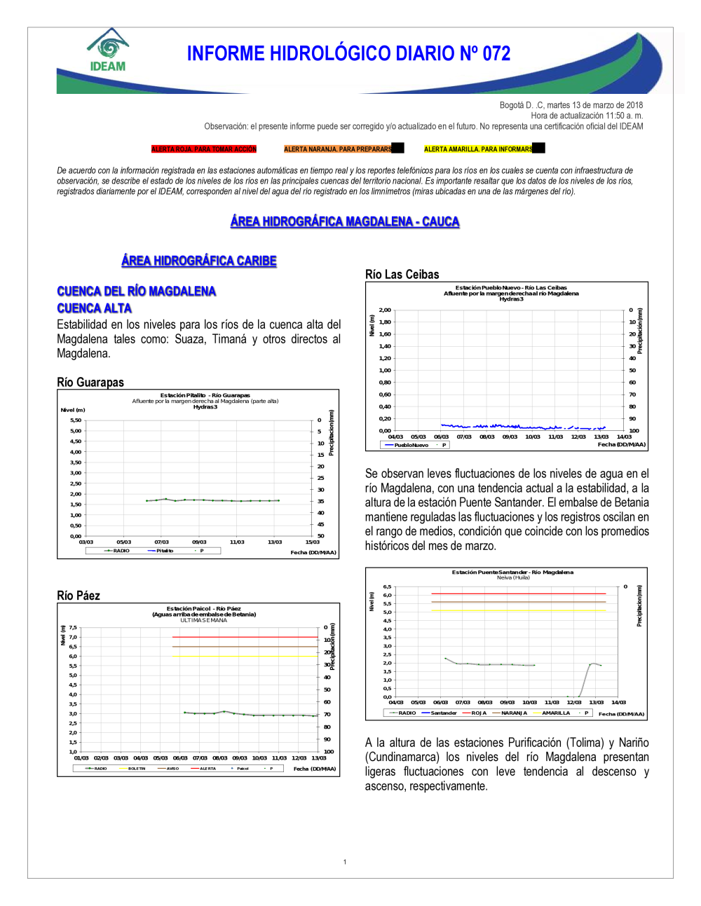 En general, el seguimiento que hace el Ideam del comportamiento hidrológico en los principales ríos del país se realiza con la información horaria en tiempo real que se recibe de las estaciones automáticas, complementadas con más de 40 estaciones hidrológicas que transmiten en las primeras horas cada mañana, los 365 días del año.