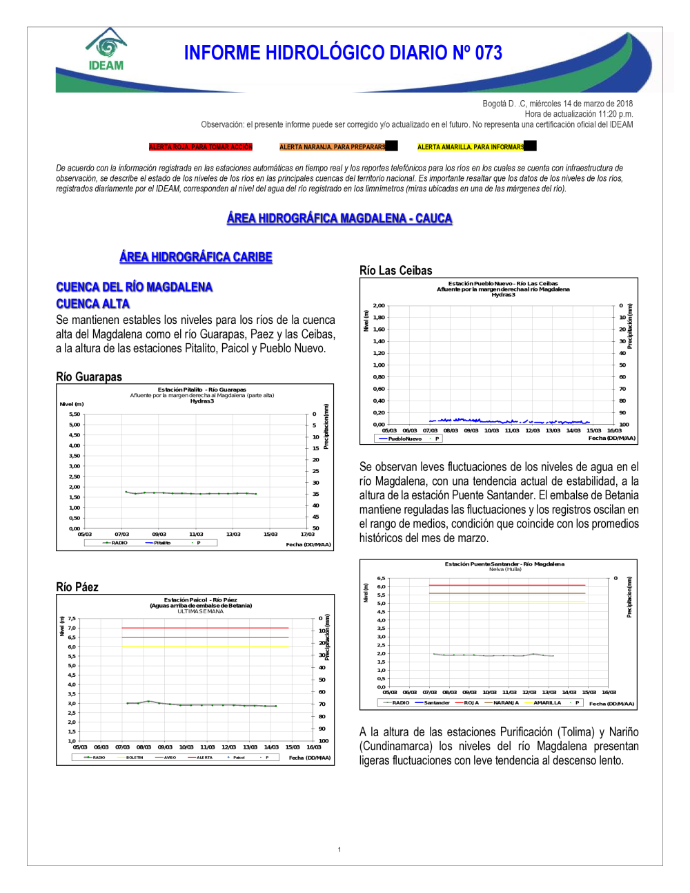 En general, el seguimiento que hace el Ideam del comportamiento hidrológico en los principales ríos del país se realiza con la información horaria en tiempo real que se recibe de las estaciones automáticas, complementadas con más de 40 estaciones hidrológicas que transmiten en las primeras horas cada mañana, los 365 días del año.