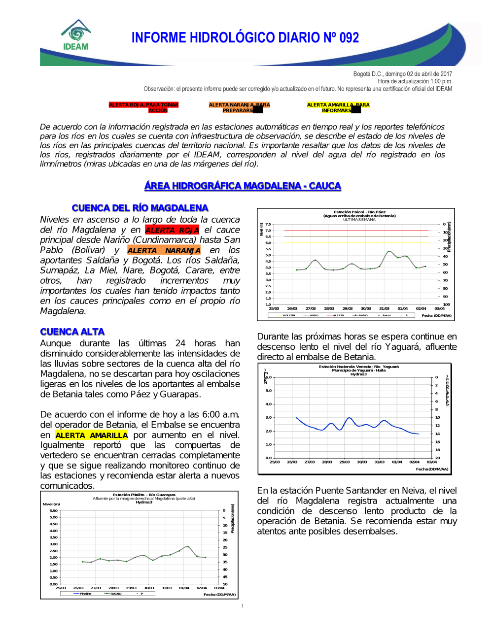 En general, el seguimiento que hace el Ideam del comportamiento hidrológico en los principales ríos del país se realiza con la información horaria en tiempo real que se recibe de las estaciones automáticas, complementadas con más de 40 estaciones hidrológicas que transmiten en las primeras horas cada mañana, los 365 días del año.