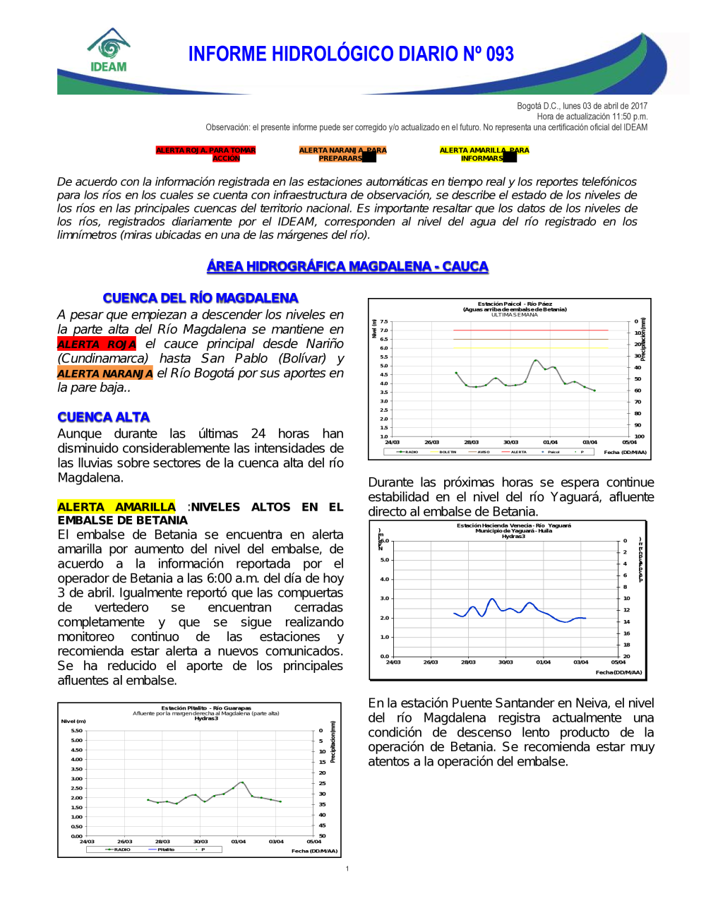 En general, el seguimiento que hace el Ideam del comportamiento hidrológico en los principales ríos del país se realiza con la información horaria en tiempo real que se recibe de las estaciones automáticas, complementadas con más de 40 estaciones hidrológicas que transmiten en las primeras horas cada mañana, los 365 días del año.