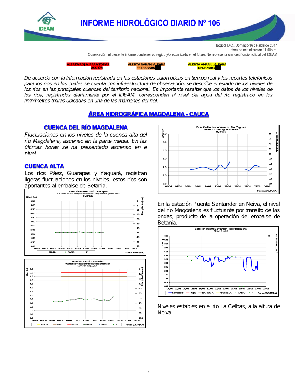 En general, el seguimiento que hace el Ideam del comportamiento hidrológico en los principales ríos del país se realiza con la información horaria en tiempo real que se recibe de las estaciones automáticas, complementadas con más de 40 estaciones hidrológicas que transmiten en las primeras horas cada mañana, los 365 días del año.