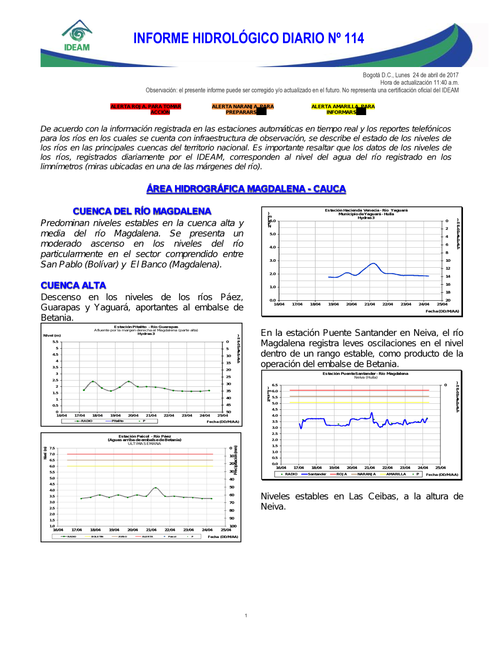 En general, el seguimiento que hace el Ideam del comportamiento hidrológico en los principales ríos del país se realiza con la información horaria en tiempo real que se recibe de las estaciones automáticas, complementadas con más de 40 estaciones hidrológicas que transmiten en las primeras horas cada mañana, los 365 días del año.