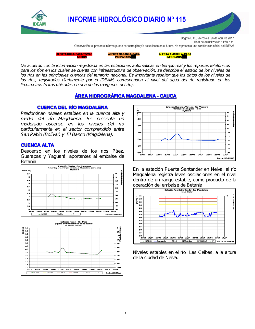 En general, el seguimiento que hace el Ideam del comportamiento hidrológico en los principales ríos del país se realiza con la información horaria en tiempo real que se recibe de las estaciones automáticas, complementadas con más de 40 estaciones hidrológicas que transmiten en las primeras horas cada mañana, los 365 días del año.