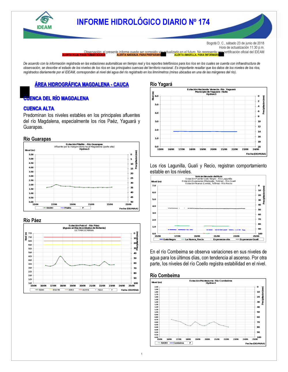 En general, el seguimiento que hace el Ideam del comportamiento hidrológico en los principales ríos del país se realiza con la información horaria en tiempo real que se recibe de las estaciones automáticas, complementadas con más de 40 estaciones hidrológicas que transmiten en las primeras horas cada mañana, los 365 días del año.