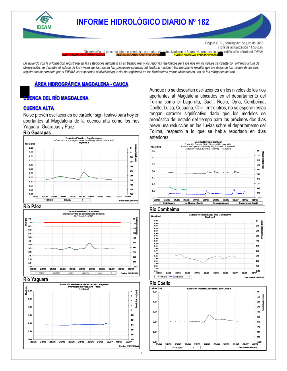 En general, el seguimiento que hace el Ideam del comportamiento hidrológico en los principales ríos del país se realiza con la información horaria en tiempo real que se recibe de las estaciones automáticas, complementadas con más de 40 estaciones hidrológicas que transmiten en las primeras horas cada mañana, los 365 días del año.