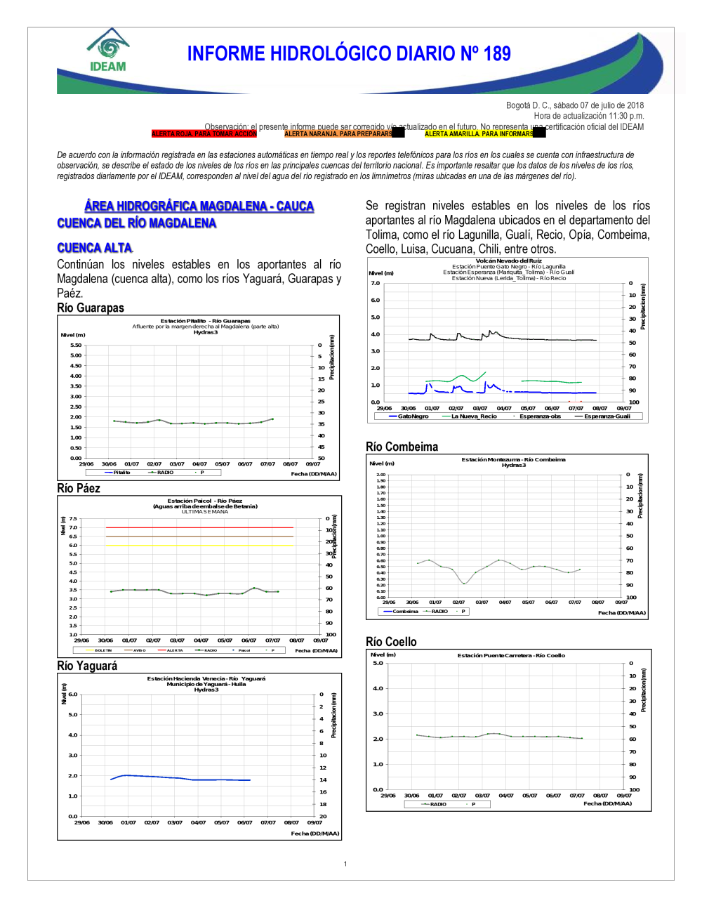 En general, el seguimiento que hace el Ideam del comportamiento hidrológico en los principales ríos del país se realiza con la información horaria en tiempo real que se recibe de las estaciones automáticas, complementadas con más de 40 estaciones hidrológicas que transmiten en las primeras horas cada mañana, los 365 días del año.