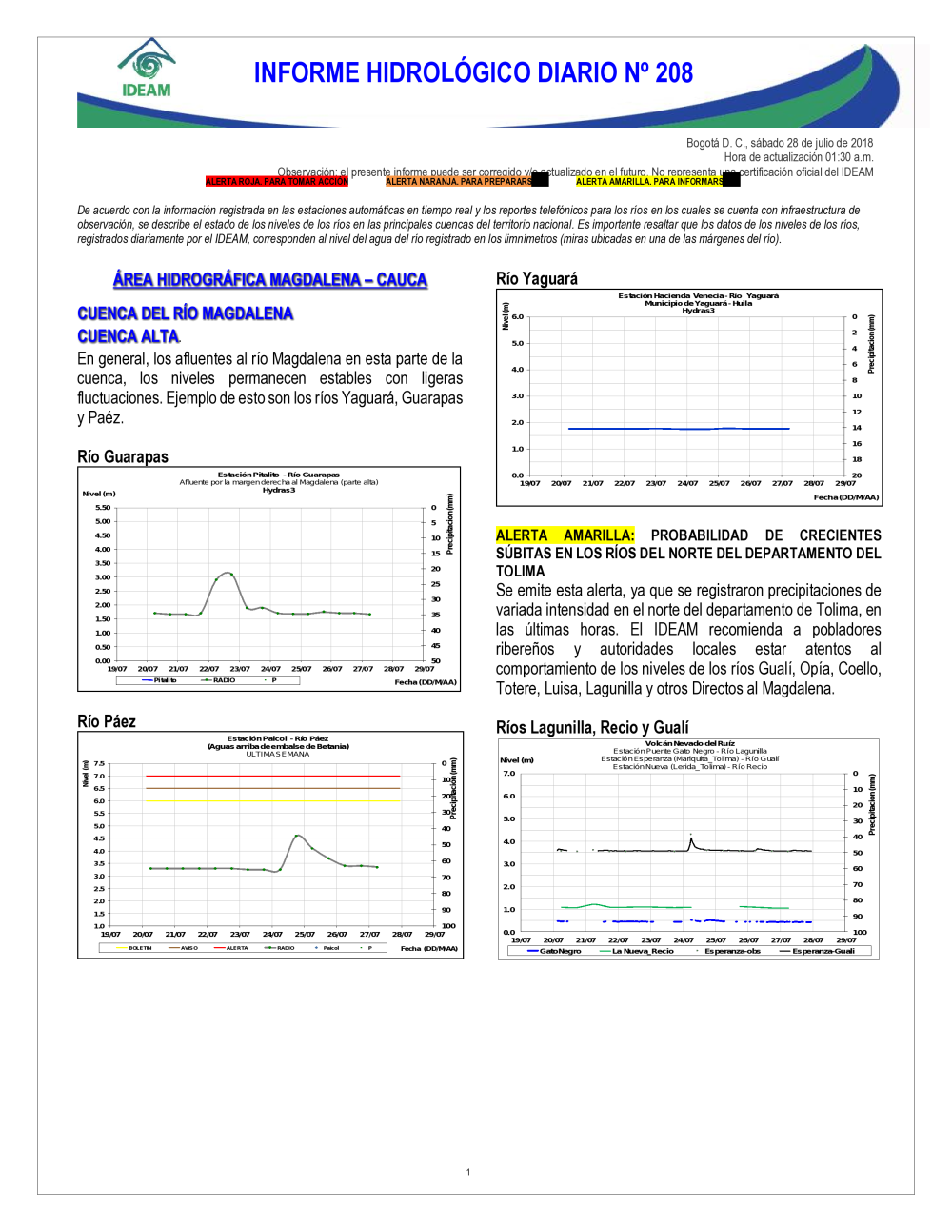 En general, el seguimiento que hace el Ideam del comportamiento hidrológico en los principales ríos del país se realiza con la información horaria en tiempo real que se recibe de las estaciones automáticas, complementadas con más de 40 estaciones hidrológicas que transmiten en las primeras horas cada mañana, los 365 días del año.