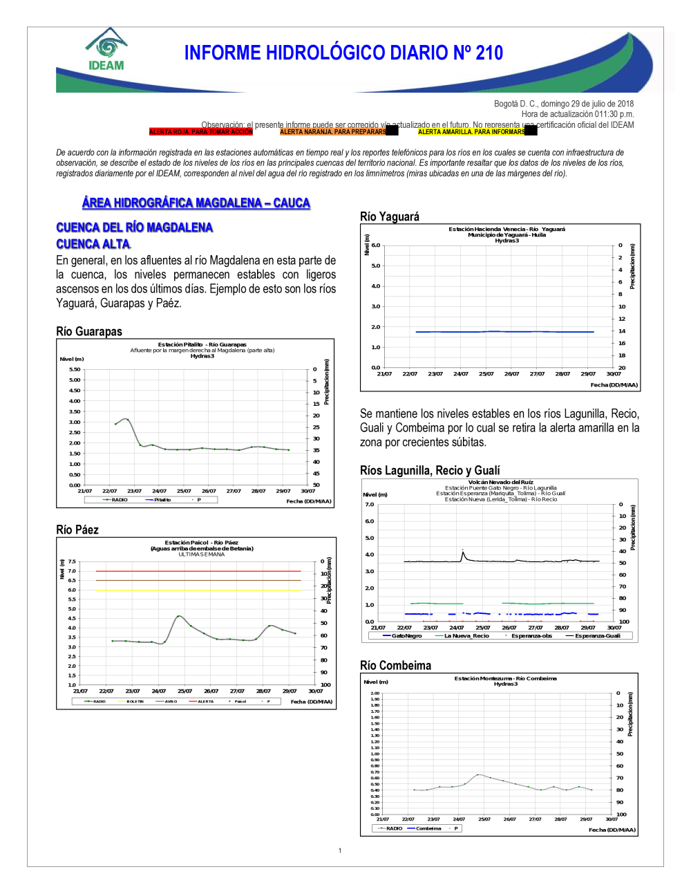 En general, el seguimiento que hace el Ideam del comportamiento hidrológico en los principales ríos del país se realiza con la información horaria en tiempo real que se recibe de las estaciones automáticas, complementadas con más de 40 estaciones hidrológicas que transmiten en las primeras horas cada mañana, los 365 días del año.
