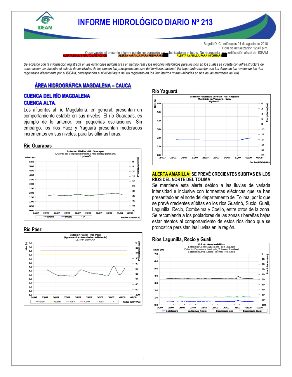 En general, el seguimiento que hace el Ideam del comportamiento hidrológico en los principales ríos del país se realiza con la información horaria en tiempo real que se recibe de las estaciones automáticas, complementadas con más de 40 estaciones hidrológicas que transmiten en las primeras horas cada mañana, los 365 días del año.