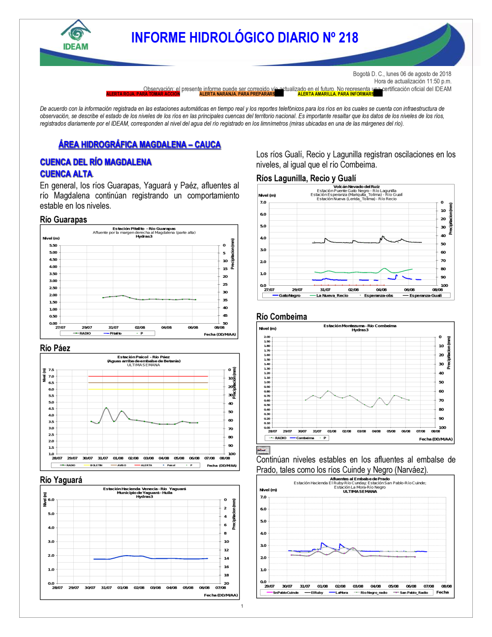 En general, el seguimiento que hace el Ideam del comportamiento hidrológico en los principales ríos del país se realiza con la información horaria en tiempo real que se recibe de las estaciones automáticas, complementadas con más de 40 estaciones hidrológicas que transmiten en las primeras horas cada mañana, los 365 días del año.