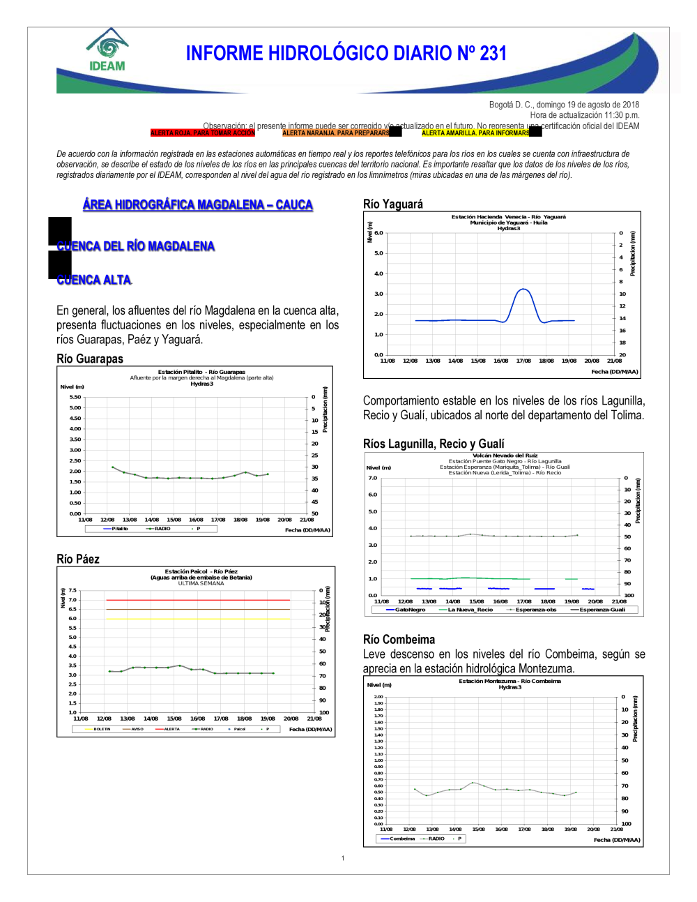 En general, el seguimiento que hace el Ideam del comportamiento hidrológico en los principales ríos del país se realiza con la información horaria en tiempo real que se recibe de las estaciones automáticas, complementadas con más de 40 estaciones hidrológicas que transmiten en las primeras horas cada mañana, los 365 días del año.