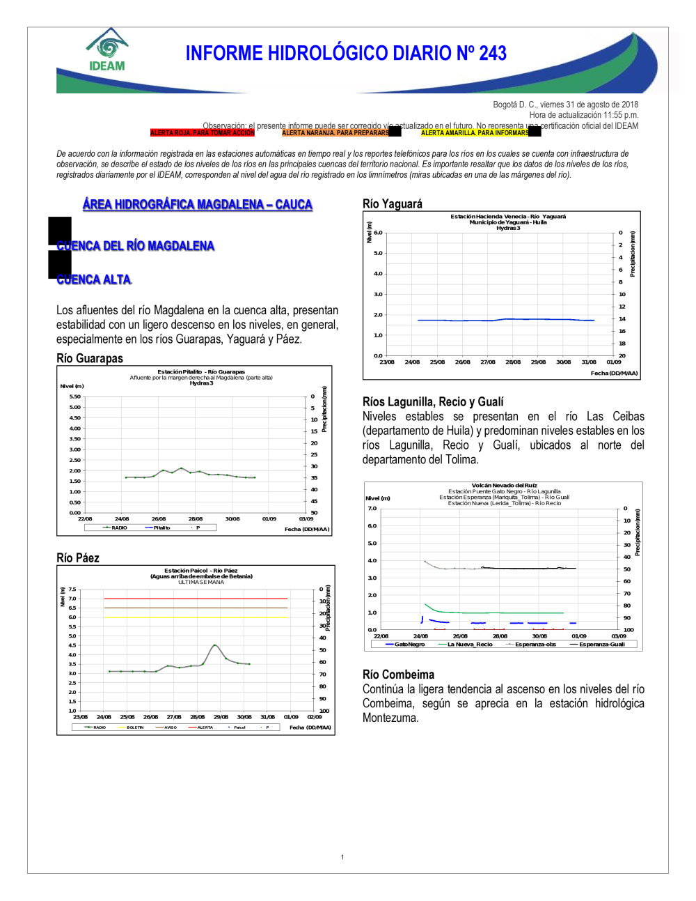 En general, el seguimiento que hace el Ideam del comportamiento hidrológico en los principales ríos del país se realiza con la información horaria en tiempo real que se recibe de las estaciones automáticas, complementadas con más de 40 estaciones hidrológicas que transmiten en las primeras horas cada mañana, los 365 días del año.