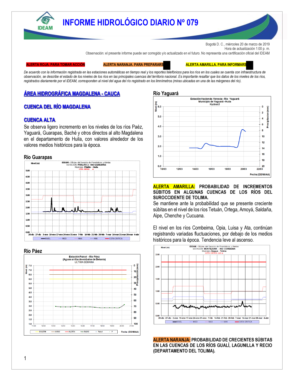 En general, el seguimiento que hace el Ideam del comportamiento hidrológico en los principales ríos del país se realiza con la información horaria en tiempo real que se recibe de las estaciones automáticas, complementadas con más de 40 estaciones hidrológicas que transmiten en las primeras horas cada mañana, los 365 días del año.