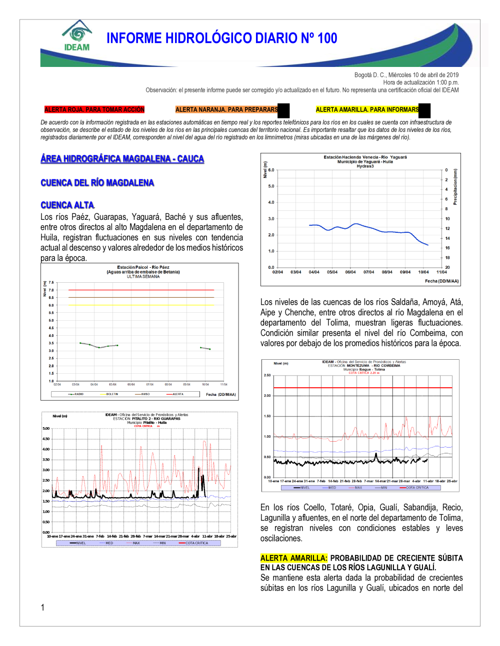 En general, el seguimiento que hace el Ideam del comportamiento hidrológico en los principales ríos del país se realiza con la información horaria en tiempo real que se recibe de las estaciones automáticas, complementadas con más de 40 estaciones hidrológicas que transmiten en las primeras horas cada mañana, los 365 días del año.