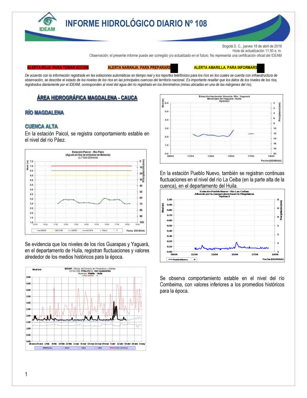 En general, el seguimiento que hace el Ideam del comportamiento hidrológico en los principales ríos del país se realiza con la información horaria en tiempo real que se recibe de las estaciones automáticas, complementadas con más de 40 estaciones hidrológicas que transmiten en las primeras horas cada mañana, los 365 días del año.